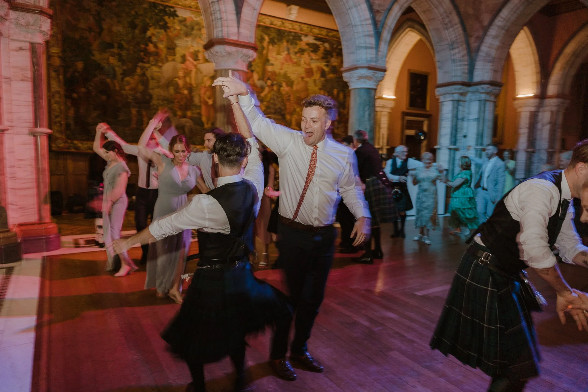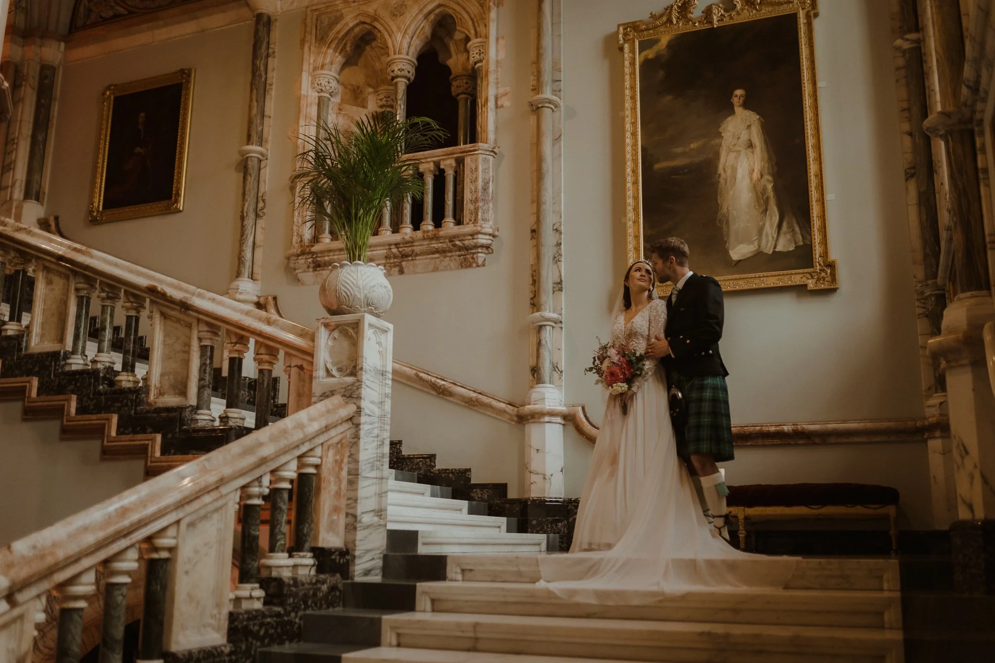 Ash & Osh had a beautiful summers wedding day from start to finish. Ash spent the morning with the girls getting ready in the Horoscope room which boasts a gorgeous conservatory flooded with natural light (perfect for the makeup artists!) Osh finished getting ready in the Billiard room with his groomsmen where they enjoyed a wee dram to calm the pre-ceremony nerves. The ceremony took place in the Marble Chapel with floor to ceiling white Sicilian marble, the ruby red stained glass ceiling floods the room with stunning red light. The ceremony was performed by Argyll & Bute registrars who the couple said were ‘flawless and easy from start to finish.’ The ceremony was perfect and truly represented their love and who they are as a couple. After their family photos in the drawing room, everyone sat for speeches and the wedding breakfast in the Marble Hall. The evening was filled with love and laughter. After the first dance, in true traditional Scottish style, was the Ceilidh (pronounced kay-lee) band who were amazing (and a personal highlight of the day!).